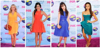 Earrings: Jou Jou Crystal Pave Round Ball Stud; Shoes: red strappy suede’s; Bracelet: Kruger Coral Enamel Hinge Cuff ) Lucy Hale was too cute for words in her “tangerine tango” (ahem… Pantone’s Color of the Year) dress with asymmetrical neckline and bronze heels so we didn’t want to change too much. We did however add a little sexy with a snakeskin bronze low heel… not for the faint of heart! (Feel free to opt for a bronze strappy low heel or sandals if you’re planning a beach wedding.) (Dresses: L-R Maria Cornejo draped washed-stain dress, AX Paris Belted Skater Dress, Hybrid Pencil with Plunge Neckline; Heels: AJ Wear Orange Mars Pump; Earrings: Yochi Design Round Beaded Hoops, Bracelet: Alkemie Sage Cuff) Tipper is absolutely dying for the above dresses! We’ve dubbed Royal Blue the Kate Middleton of all colors and we must say Zooey Deschanel’s prom-inspired dress would fit any formal wedding party in royal fashion. We paired her flared skirt with a halter top and her straight neckline with an asymmetrical hemline to give her dress a little flare.