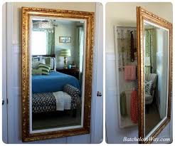 Cute blue bird on table was bought new from Big Lots. Refinished second hand nesting tables with blue spray paint. Bought extra large mason jar second hand for 25 cents. Tinted them blue myself and added silk flowers bought at a second hand shop. Used mirror I already had. This mirror now holds a secret I will reveal below. Crown molding purchased from the Restore for $20.